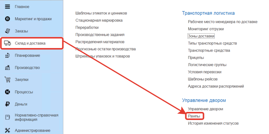 Для хранения списка рамп на складах используется справочник "Рампы", который расположен в разделе "Склад и доставка" в подсистеме "Управление двором"