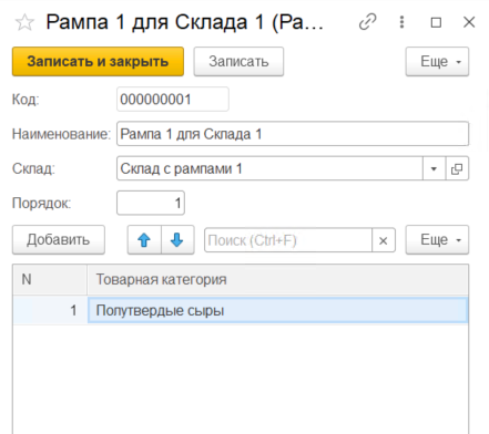 - Список товарных категорий - если список пустой, то с рампы отгружаются все товарные категории. Если список заполнен товарными категориями, то при подборе рампы для машины, в которую должны быть погружены товары указанных товарных категорий, система подберет рампу с наименьшим порядком содержащую одну из категорий из планов отгрузки