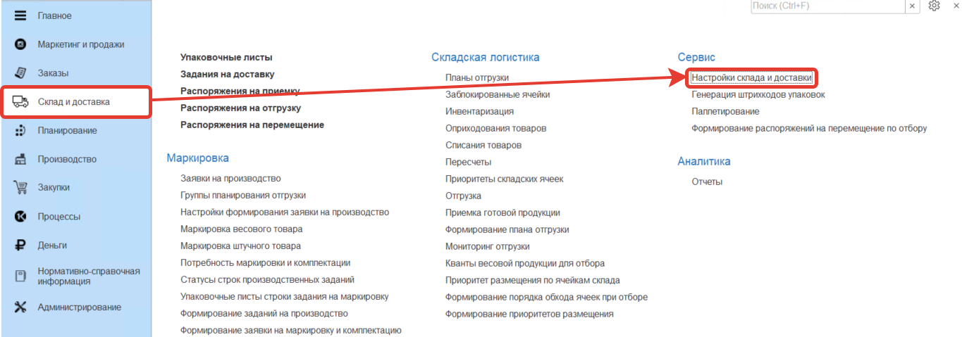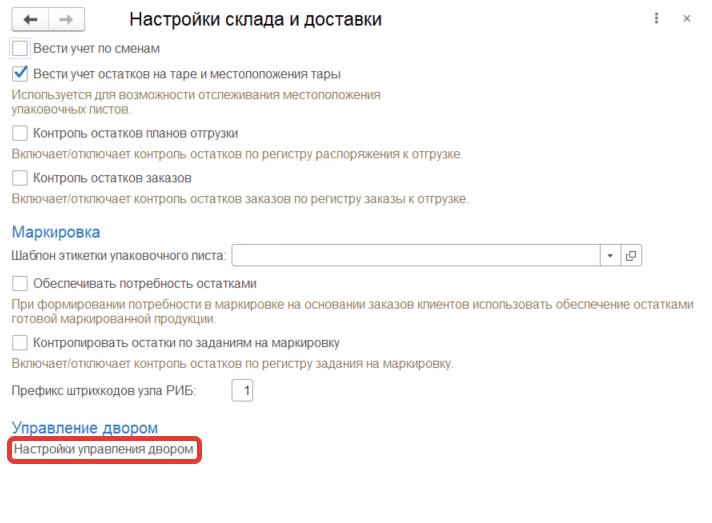 Для хранения настроек управления двором используется справочник "Настройки управления двором", который расположен в разделе "Склад и доставка" в подсистеме "Сервис" - "Настройки склада и доставки"